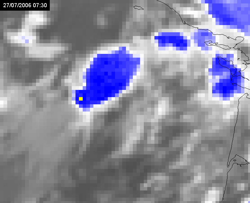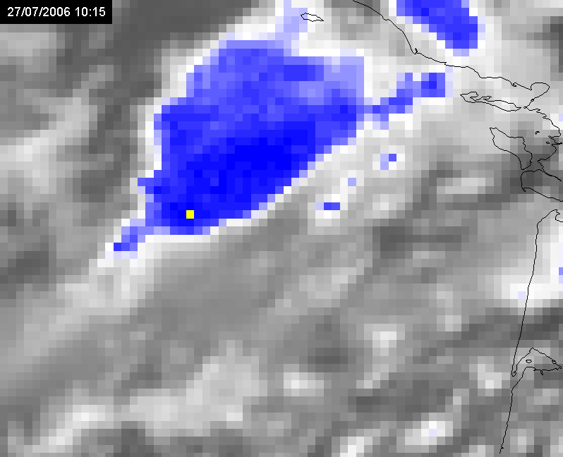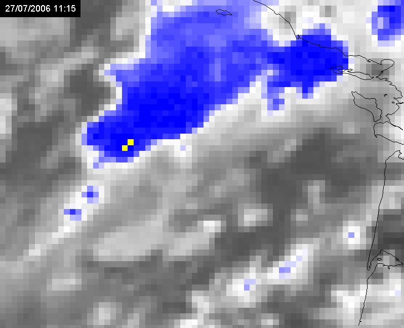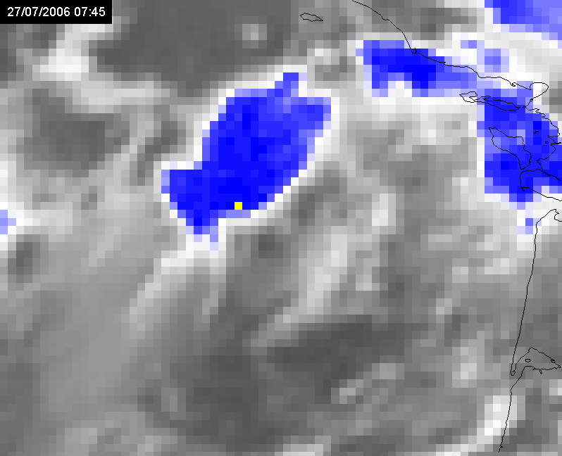 27 July 2006/06.00 UTC Meteosat 8 IR10.8-WV6.2 difference image (overshooting tops in yellow)