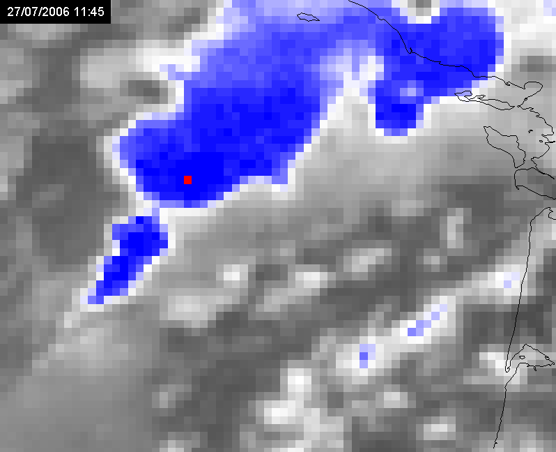 The second corresponds to an event over the Gulf of Biscay, west of Nantes on 27 July 2006. Besides the train effect easily detected in the animation above over the Gulf Biscay (shown below), there was also another similar situation over southeastern UK on the same day (analyzed later). In the remaining of this special investigation, the focus will be made on the events with MSG data.
