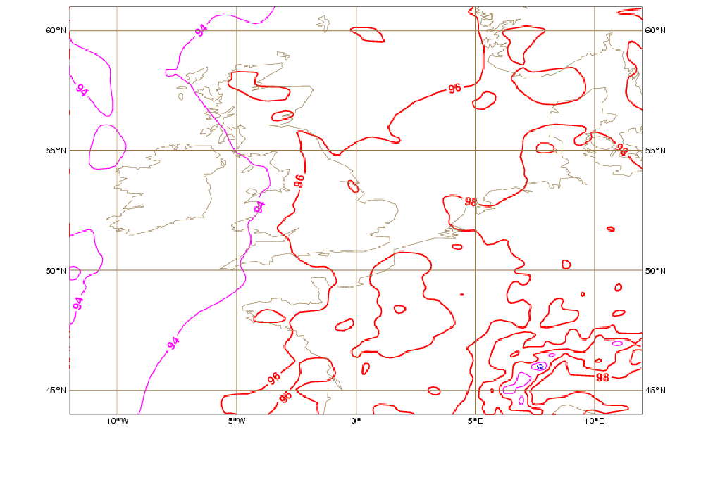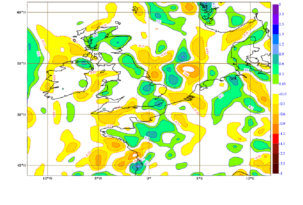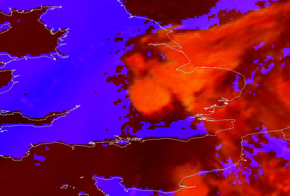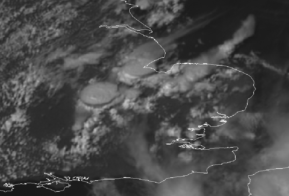 From midday onwards during the same day, a formation of different convective systems over south UK, in an area between Leicester, Oxford and Cambridge, also fitted the train effect, but in this case a ridge (check the 18°C isotherm) is stretching from France into the UK.