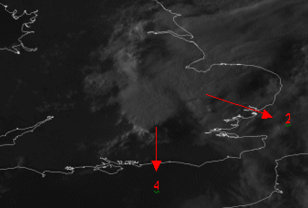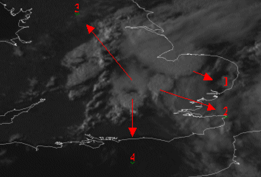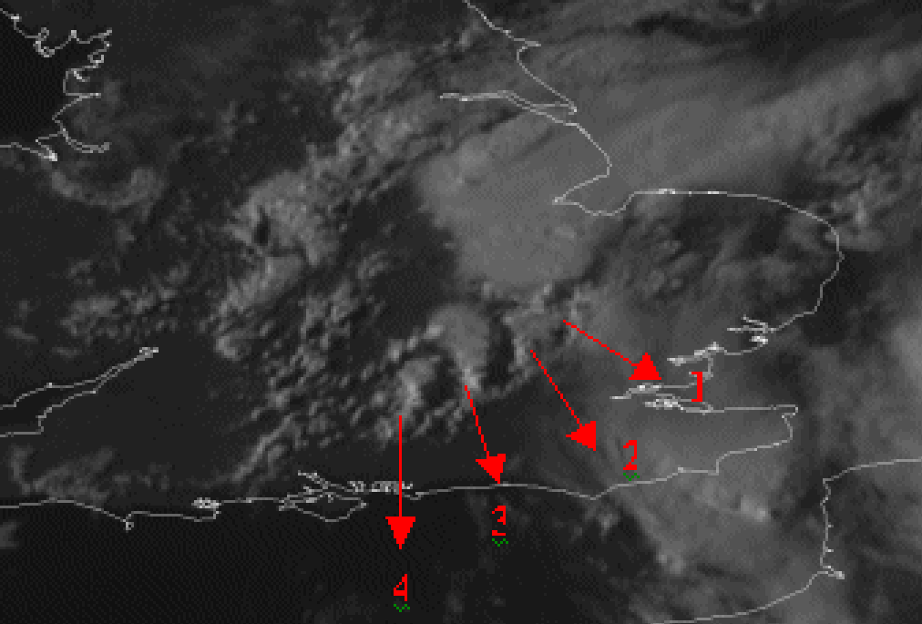27 July 2006/17.00 UTC Meteosat 8 HRV image. Individual cells numbered from 1 to 4