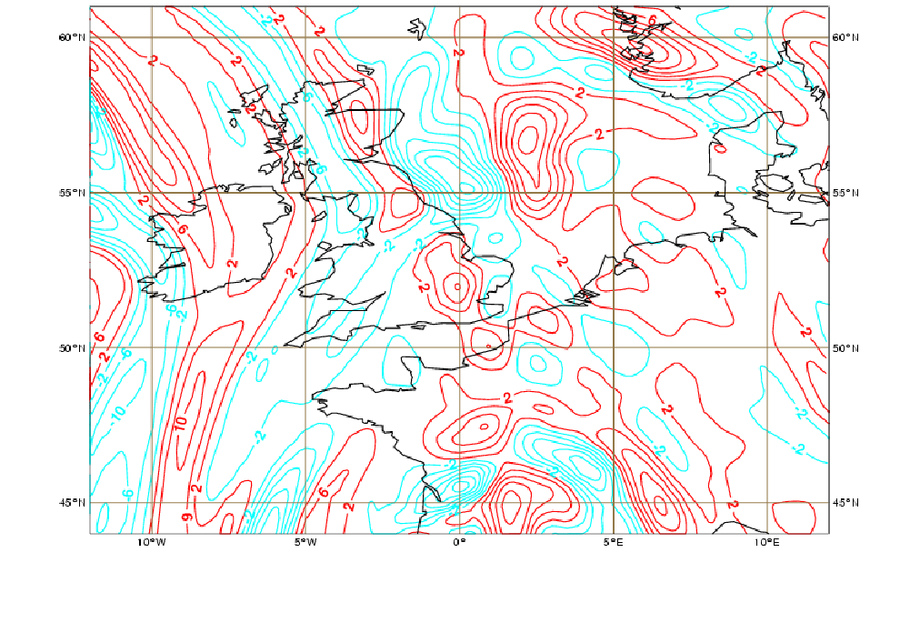 Vorticity advection at 300 hPa has also been found to show areas of local maxima around the spot for successive convection. It should be noted, however, that these maxima may not be in a clear relation to an upper-level jet or strong tropopause anomalies, but rather related to weak tropopause anomalies (see similarities with the conceptual model Enhancement of convection by PV, Convective Cloud Features In Typical Synoptic Environments: Enhancement of convection by PV ). Again, like for specific humidity convergence, other local maxima may be present. Therefore, nowcasting will help finding the first convective bursts and check if there is or not stationarity of the systems.