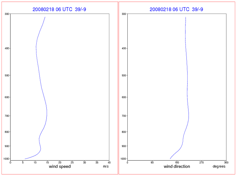 18 February 2008/06.00 UTC - Vertical profile; left: wind speed; right: wind direction
