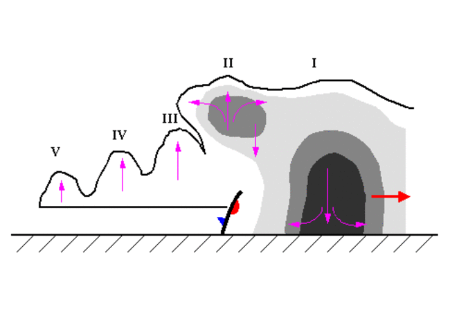 | Step 1 - Cell I is forming over the position of a low level outflow boundary (plotted for the sake of simplicity as a stationary front) with a strong updraft above and divergence in the upper troposphere. | |