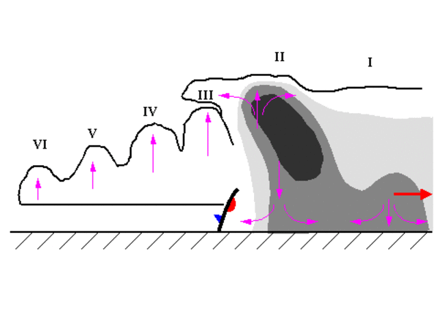 - The downdraft initiates successive developments of new cells which can be observed as gust fronts