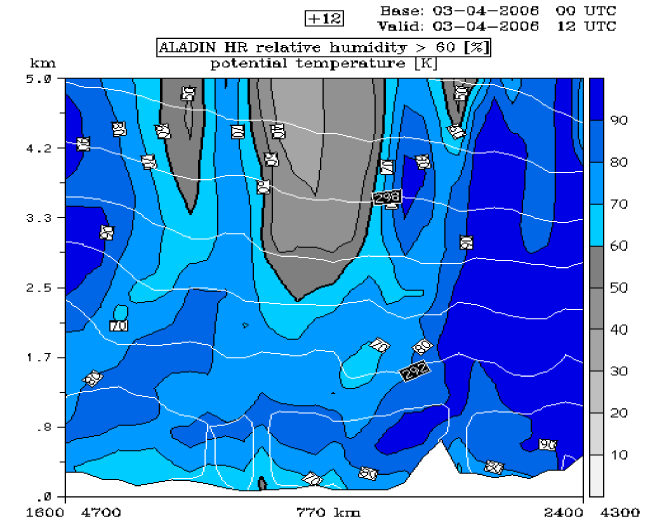 03 April 2006/12.00 UTC - ALADIN model vertical cross section B; white: isentropes, blue and grey shaded: relative humidity
