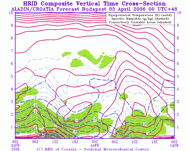 03-04 April 2006 - ALADIN model time vertical cross section for Budapest; magenta: equipotential temperature, blue dashed: specific