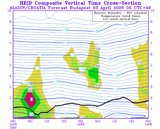 03-04 April 2006 - ALADIN model time vertical cross section for Budapest; black-dotted: LCL, blue: temperature and shaded: relative