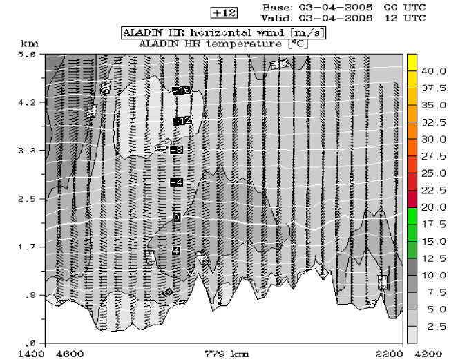 03 April 2006/12.00 UTC - ALADIN model vertical cross section A; grey shaded: wind speed, wind barbs: wind direction