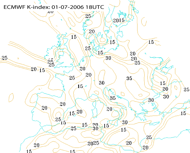 01 July 2005/18.00 UTC - ECMWF model analysis field, K index