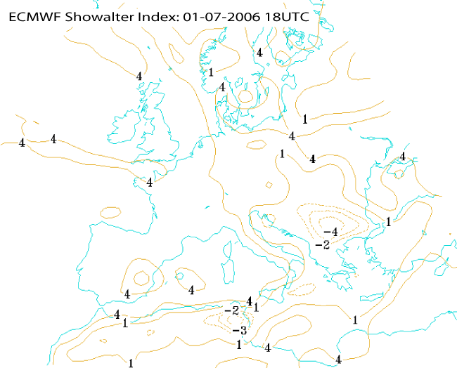 01 July 2005/18.00 UTC - ECMWF model analysis field, Showalter index
