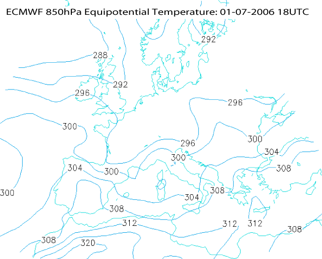 01 July 2005/18.00 UTC - ECMWF model analysis field, equivalent potential temperature 850 hPa