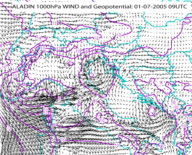 01 July 2005/09.00 UTC - ALADIN model forecast field, wind and geopotential 1000 hPa