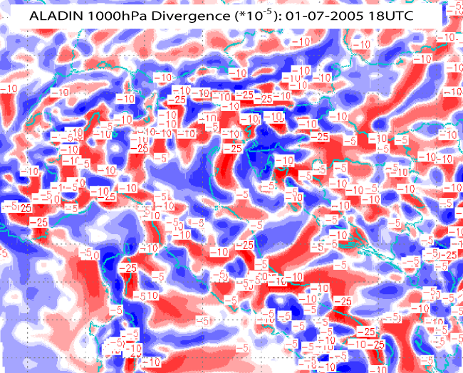 01 July 2005/18.00 UTC - ALADIN model forecast field, divergence 1000hPa