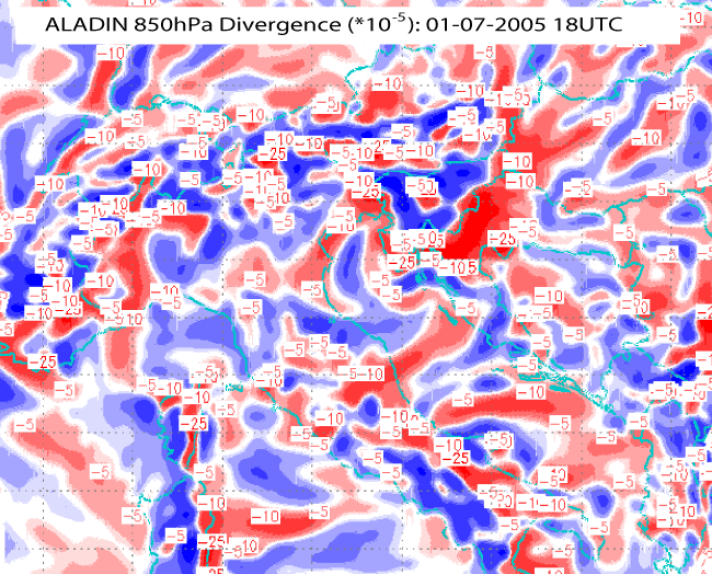01 July 2005/18.00 UTC - ALADIN model forecast field, divergence 850hPa