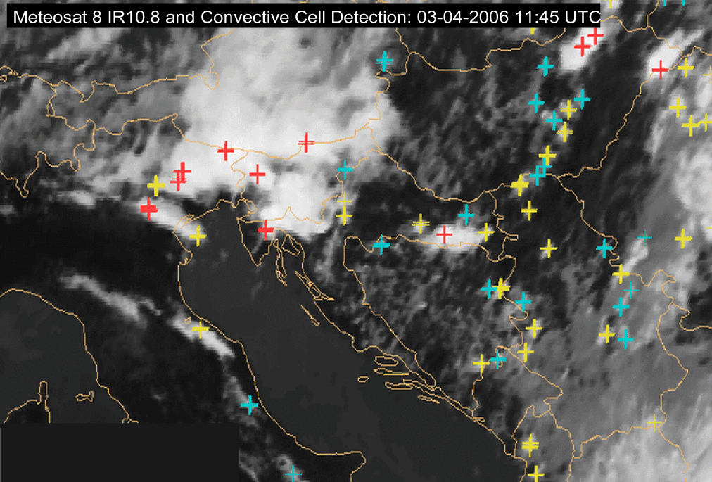 The above example shows the full life cycle of a convective system. In the unstable air of a thermal ridge, individual Cbs started to appear in southern Austria and Slovenia in the late morning hours of 03 April 2006, and around midday, as seen in the 10.00 UTC image, they already grew to become a well developed cluster. In the right column Meteosat 8 IR 10.8 satellite images with nowcasting product Convective Cell Detection overlaid can be seen. Nowcasting algorithm used in this investigation detects convective cells on the basis of their temperature and radius, with three temperature thresholds where blue cross indicates the cell with cloud top temperature lower than -33°C, yellow lower than -42°C and red lower than -50°C. It can be noticed that the cluster is developing quite rapidly taking about 4 hours to become a MCS covering the area of Slovenia, southern Austria and eastern Italy.