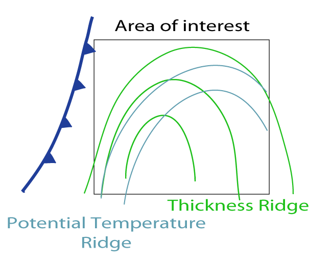 The unstable environment favourable for the occurrence of Cb clusters in Warm Air can be recognized by a thickness ridge (see Cumulonimbus (Cb) and Mesoscale Convective System (MCS) - Meteorological Physical Background ) and a ridge in the potential temperature