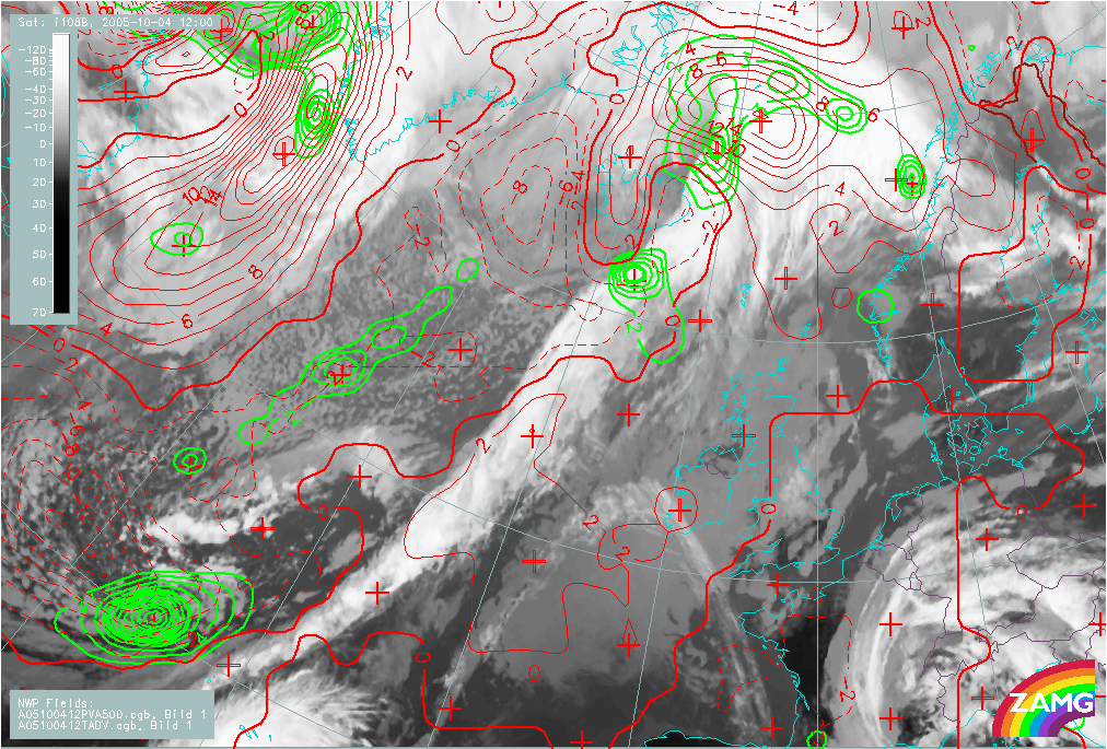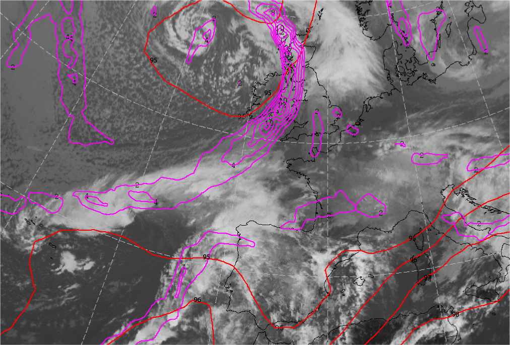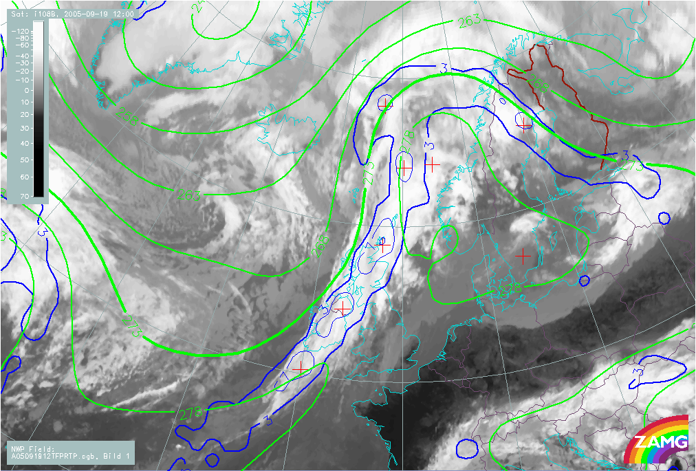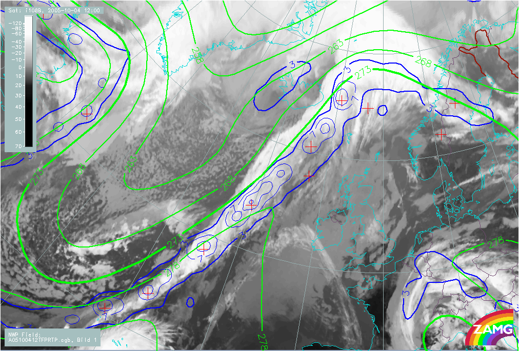 19 October 2004/12.00 UTC - Meteosat IR 10.6 image; red: Boyden index, cyan: TFP