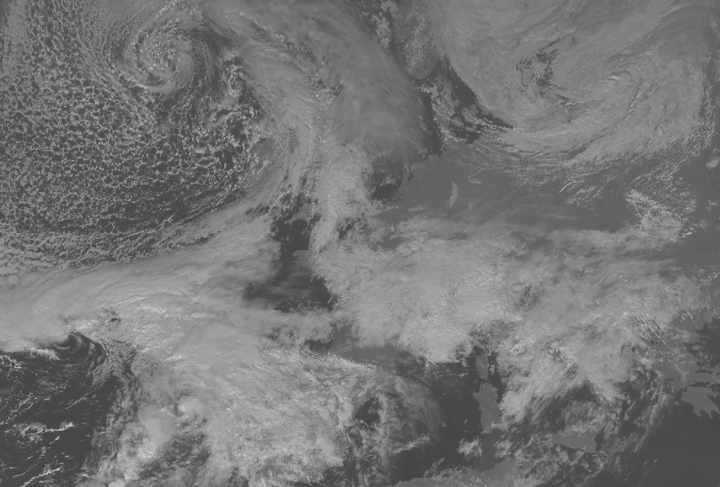 | WV | Light grey with embedded brighter structures and a dark stipe at the rear of and parallel to the cloud band; A second dark stripe across mid-Norway and Sweden, perpendicular to the Kata Cold front band. Penetration of the dry air is not visible in this case. |