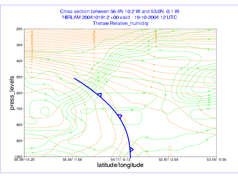 19 October 2004/12.00 UTC - Vertical cross section; ochre: wet bulb temperature (Θw)