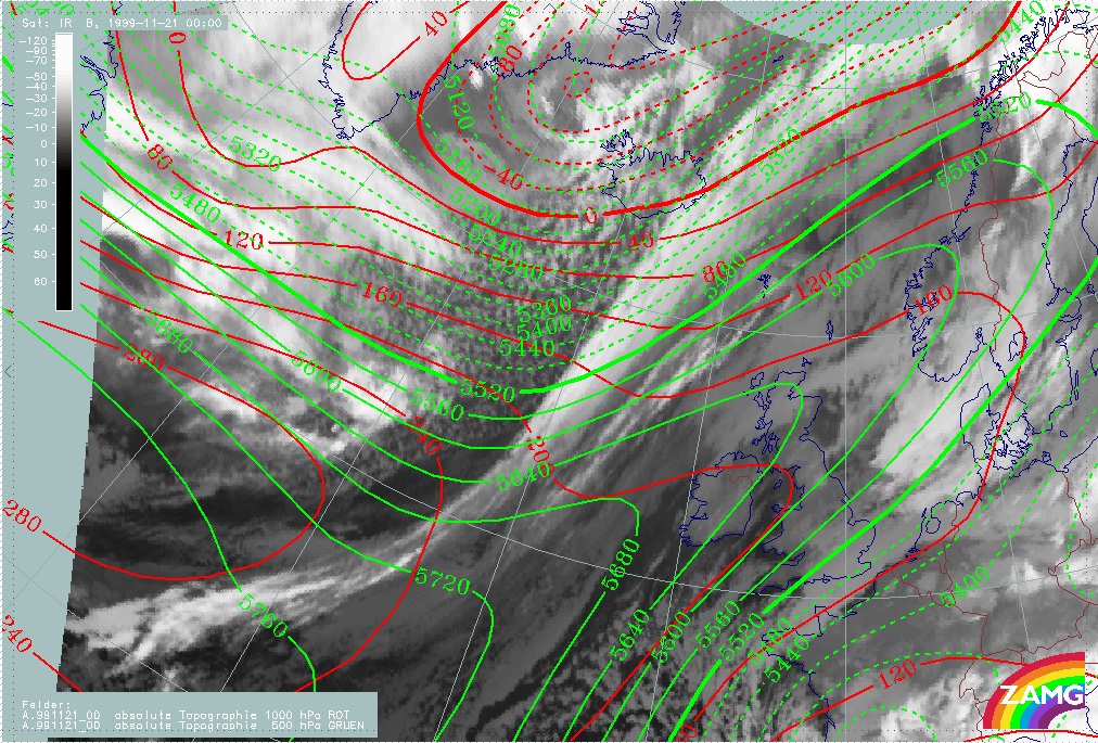 21 November 1999/00.00 UTC - Meteosat IR image; green: height contours 500 hPa, red: height contours 1000 hPa