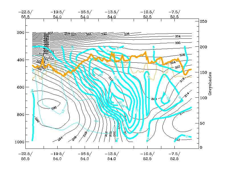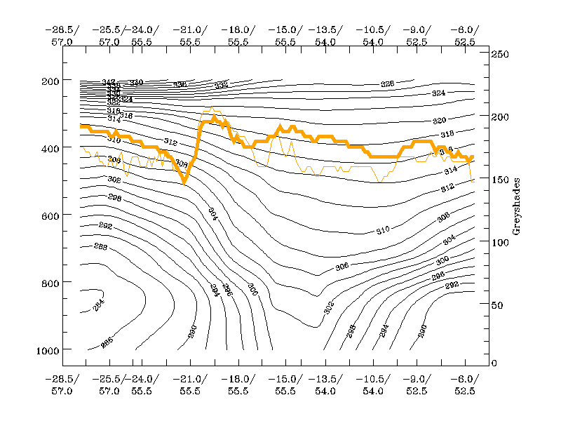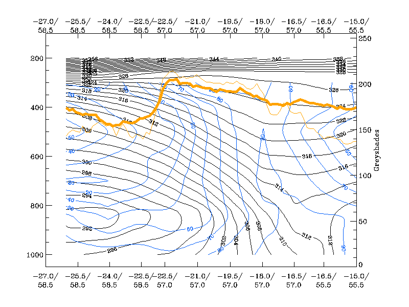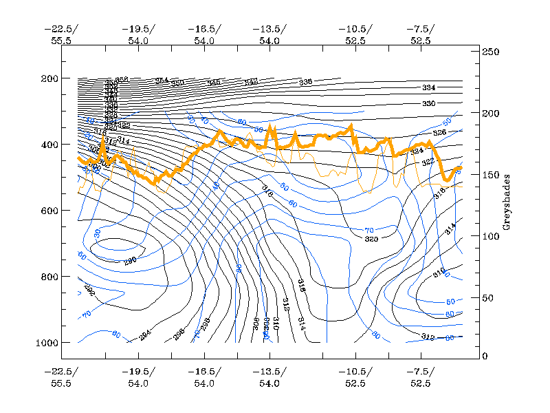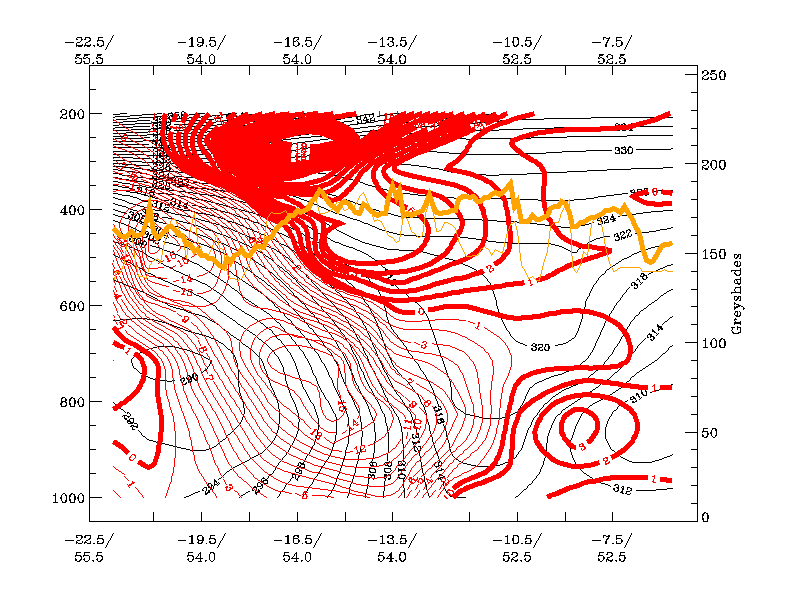 21 November 1999/00.00 UTC - Vertical cross section; black: isentropes (Θe), orange thin: IR pixel values, orange