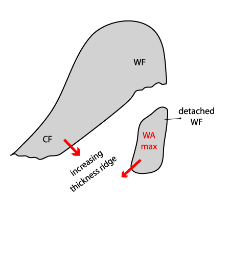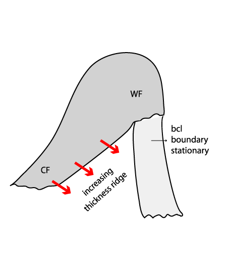 - The warm conveyor belt acquires a component which is inclined forwards relative to the movement of the Cold Front. Therefore, frontal clouds and precipitation tend to lie ahead of the surface front.