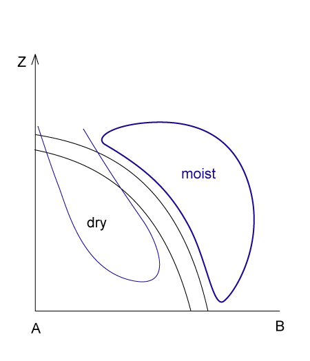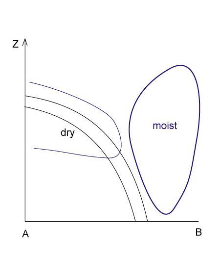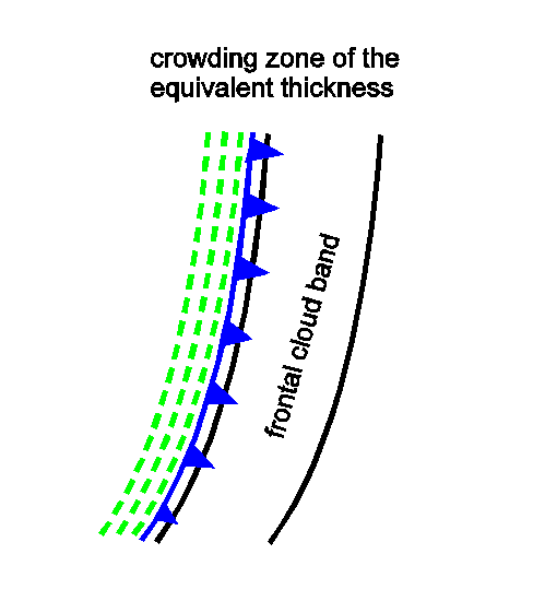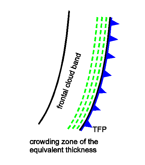 There is group of Cold Front cloud bands that deviates from the ideal configurations almost only in the configuration of the isentropes: instead of the downward inclined zone of high gradients of isentrops a configuration typical for an Occlusion cloud band exists namely an isentropic trough (see Occlusion: Warm Conveyor Belt Type - Typical appearance in vertical cross section).