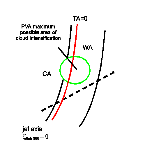 There is relatively weak warm advection ahead of the Cold Front, and pronounced cold advection behind it.- Ana Cold Front: cloudiness usually lies within CA, TA=0 ahead of cloud band