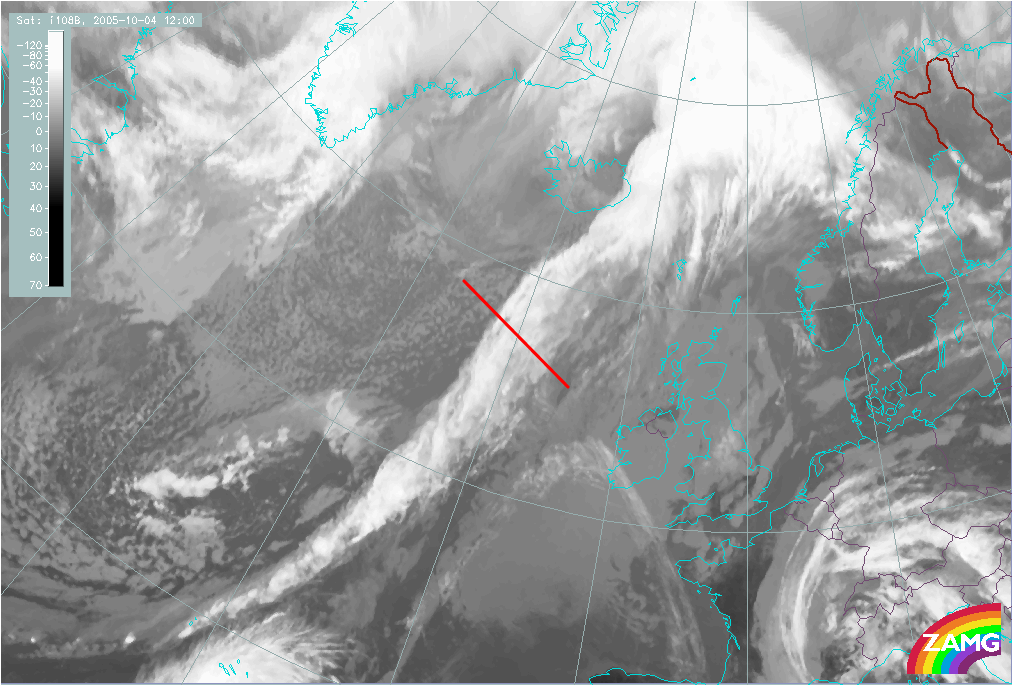 04 October 2005/12.00 UTC - Meteosat 8 IR 10.8 image; position of vertical cross section indicated