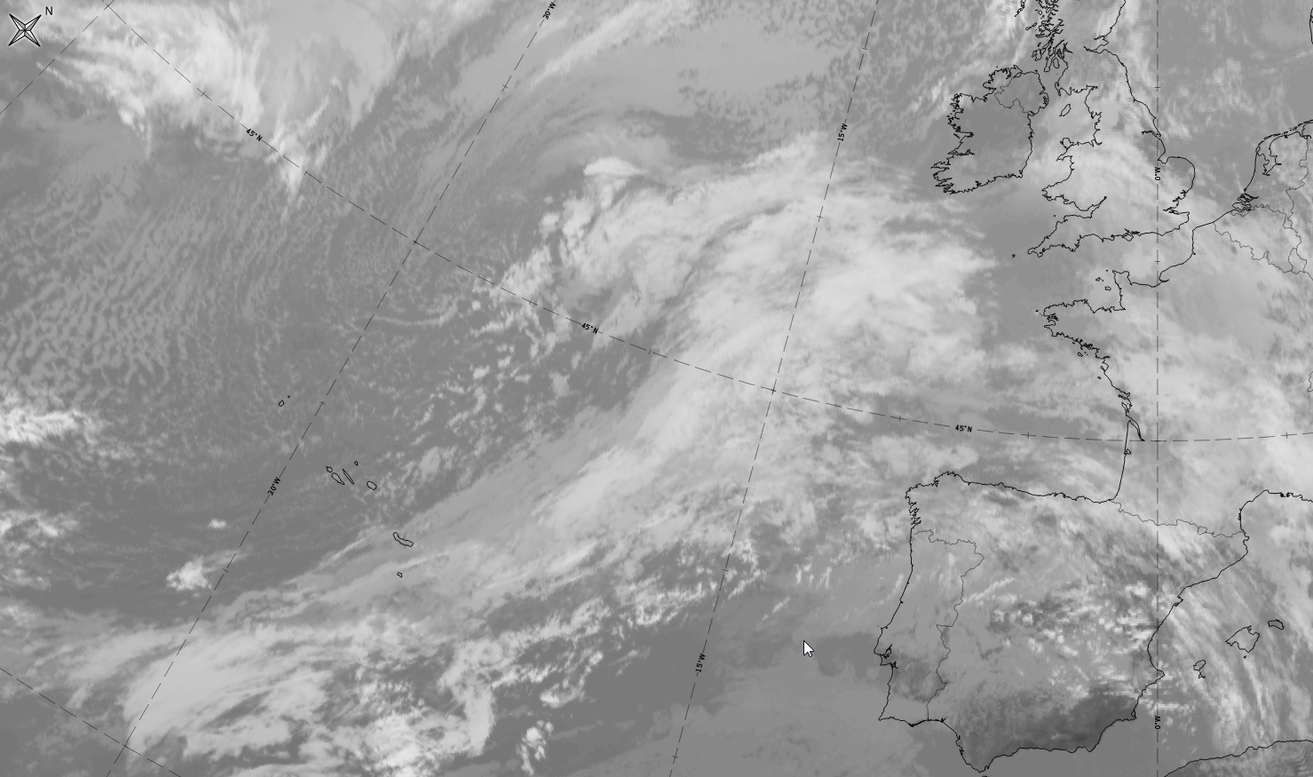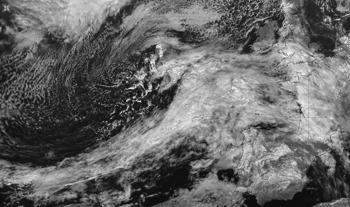 | IR | Grey areas with some brighter cloud fibres above; grey areas in the Cold Front band are darker than in the occlusion and warm secto.r |
