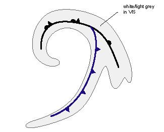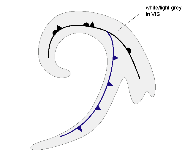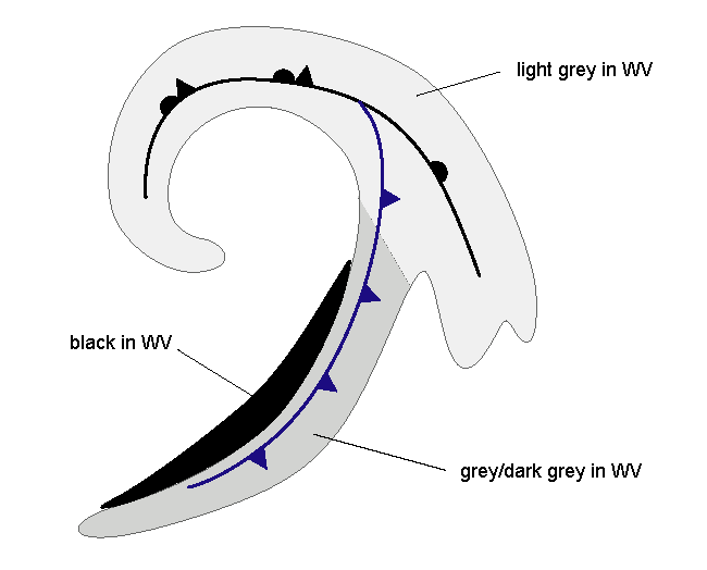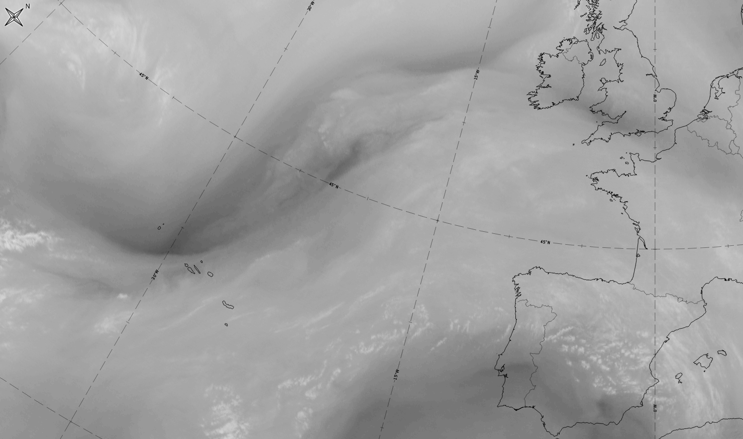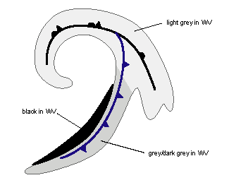 | WV | Grey to dark grey band; black stripe at the rear representing sinking dry air. |
