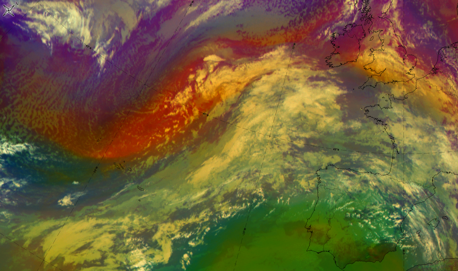 The cloud band looks very similar in the Airmass RGB to its appearance in the IR image. However, there are often areas where a brownish shadow is superimposed, indicating penetrating dry air.