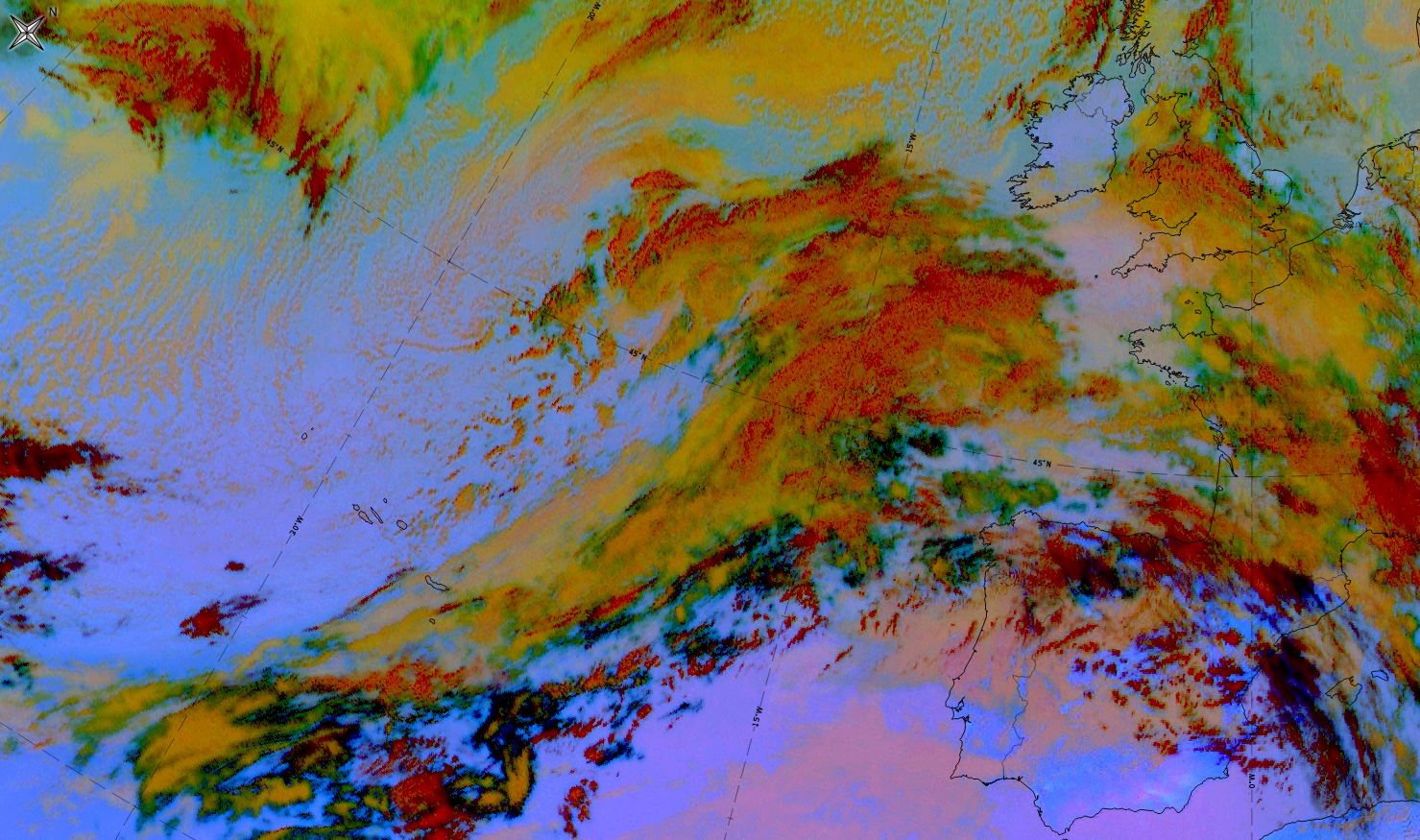 | Dust RGB | Ochre colours indicate mid-level clouds. |