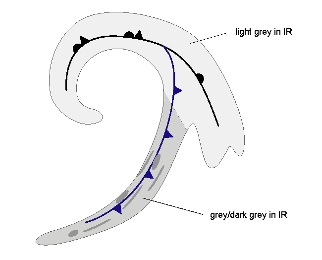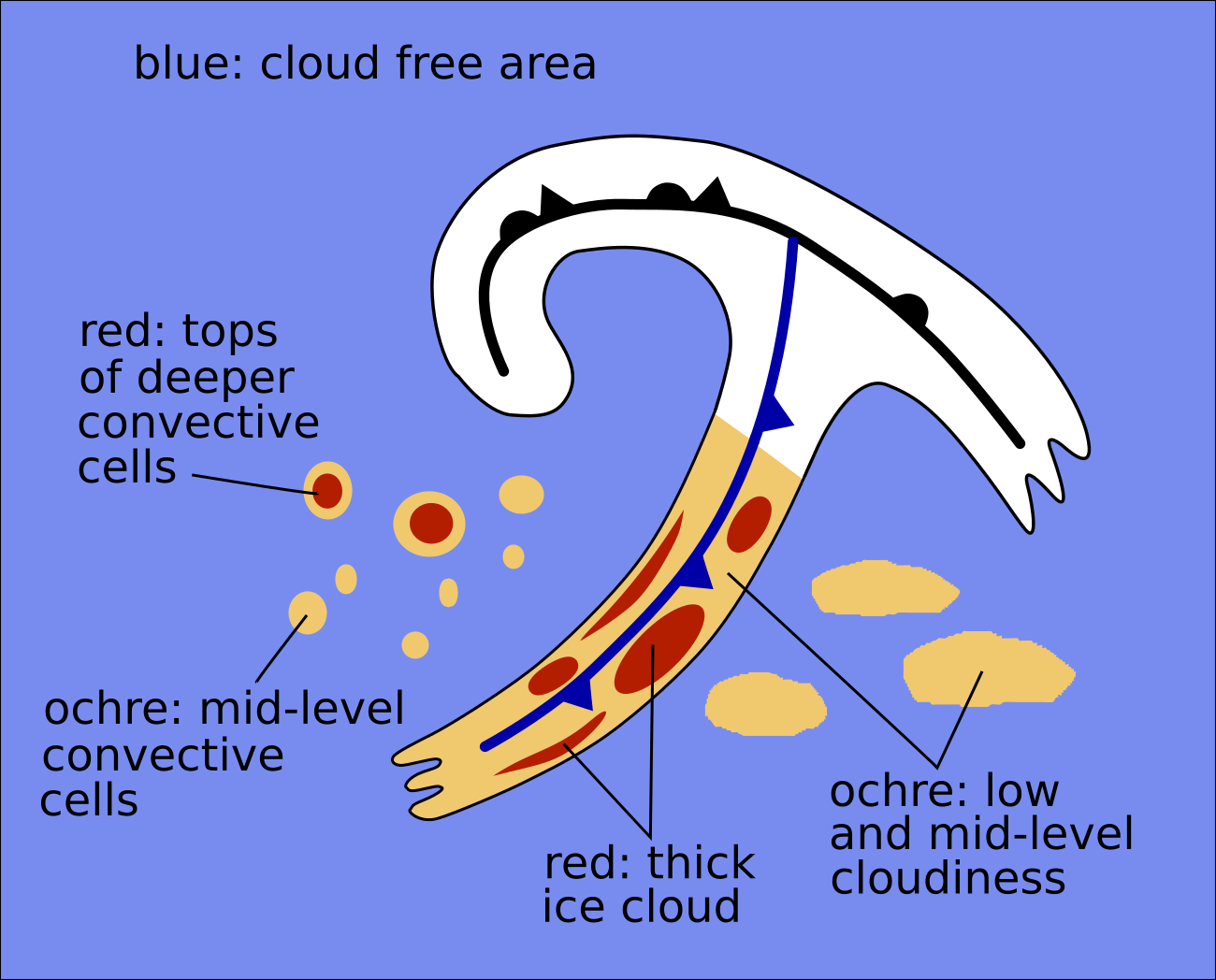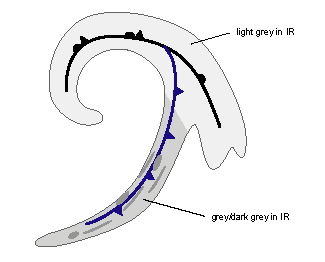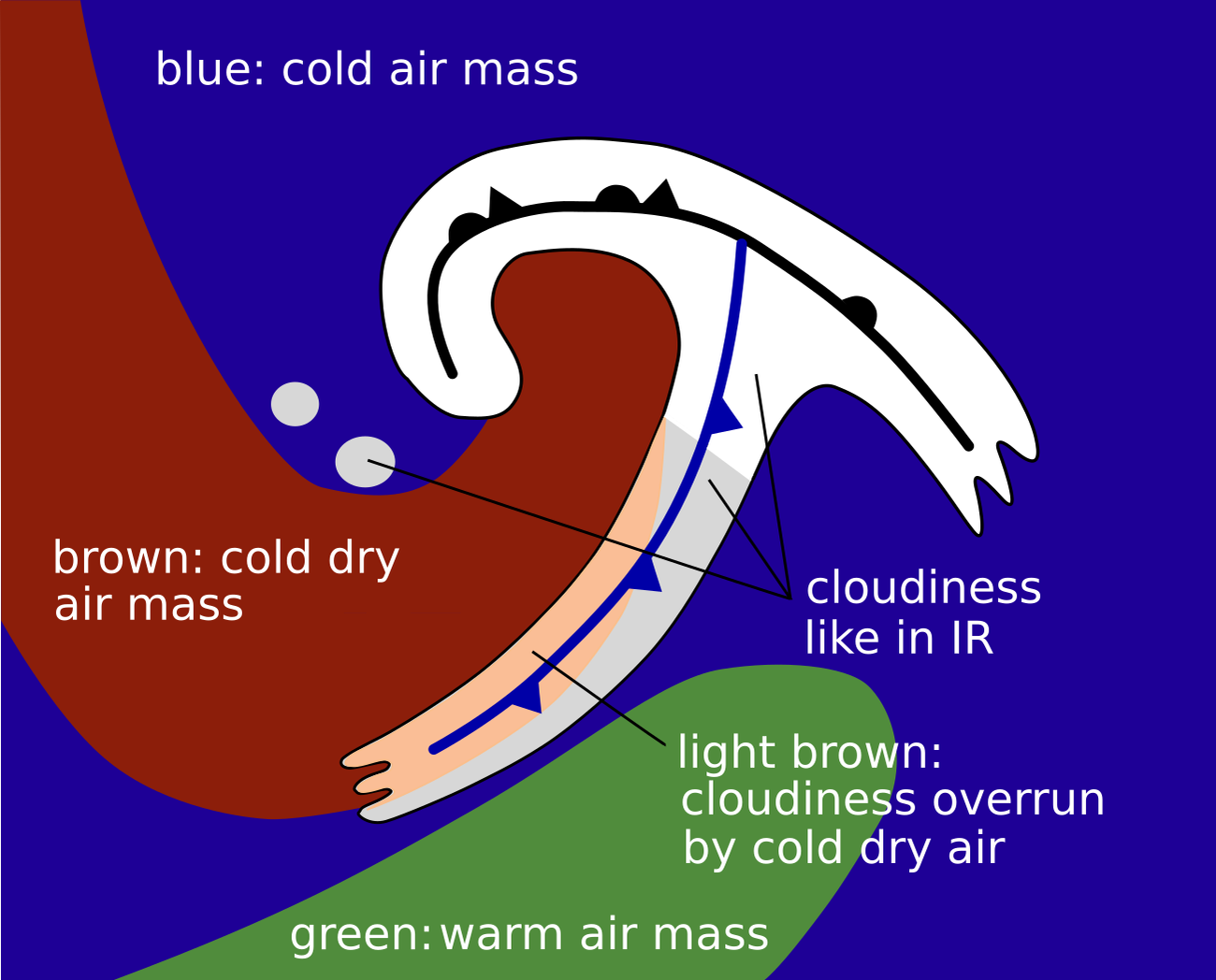 - In IR images a grey, broken cloud band, which is clearly darker than other frontal parts (e.g. warm front or occlusion) of the system