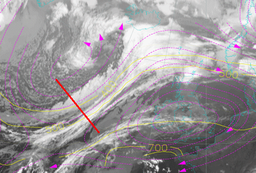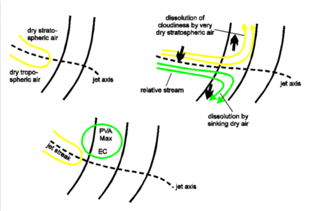 Associated with the approaching jet streak, a PVA maximum situated in the left exit region may be superimposed upon the low cloud band of the Split Front ( link to Jet Streak model). Within this area the development of the above mentioned EC-like cloudiness can often be observed (see Front Intensification By Jet Crossing - Cloud structure in satellite image ).
