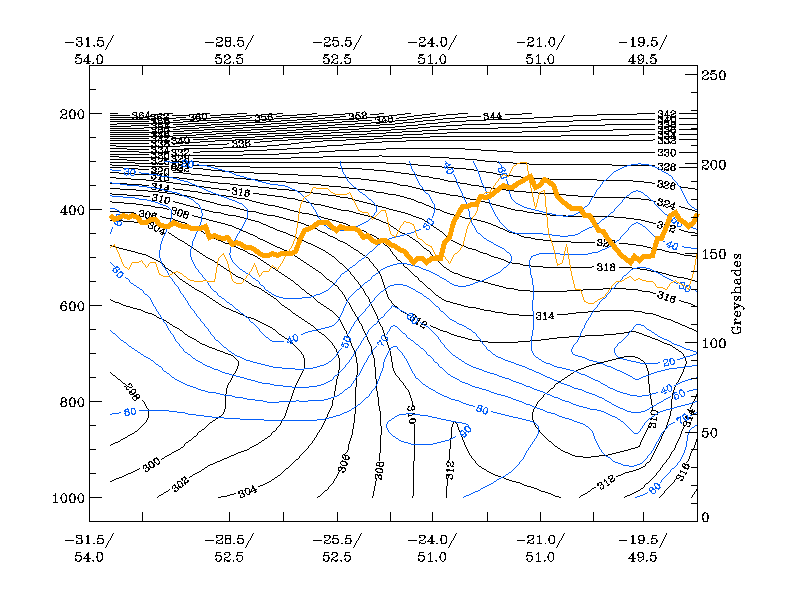 30 August 2005/06.00 UTC - Vertical cross section; black: isentropes (ThetaE), blue: relative humidity, orange