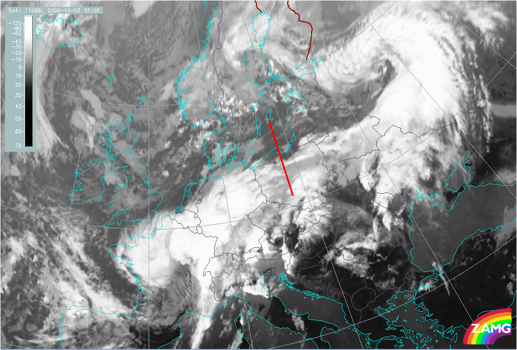 03 October 2006/12.00 UTC - Meteosat 8 IR10.8 image; position of vertical cross section indicated