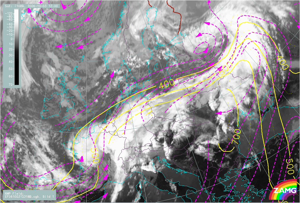 03 October 2006/12.00 UTC - Meteosat 8 IR10.8 image; magenta: relative streams 318K, yellow: isobars 318K