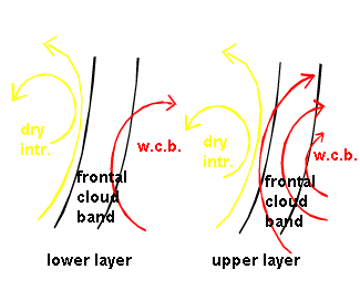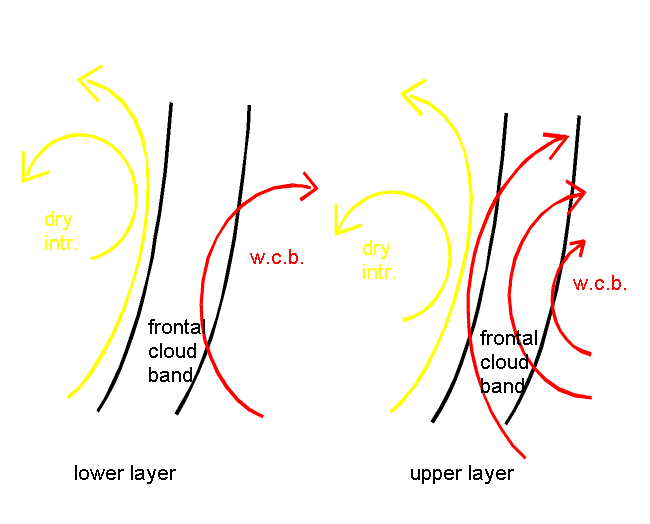 As there is only one conveyor belt involved, the temperature and humidity contrasts are rather weak in the area of the frontal cloud band.