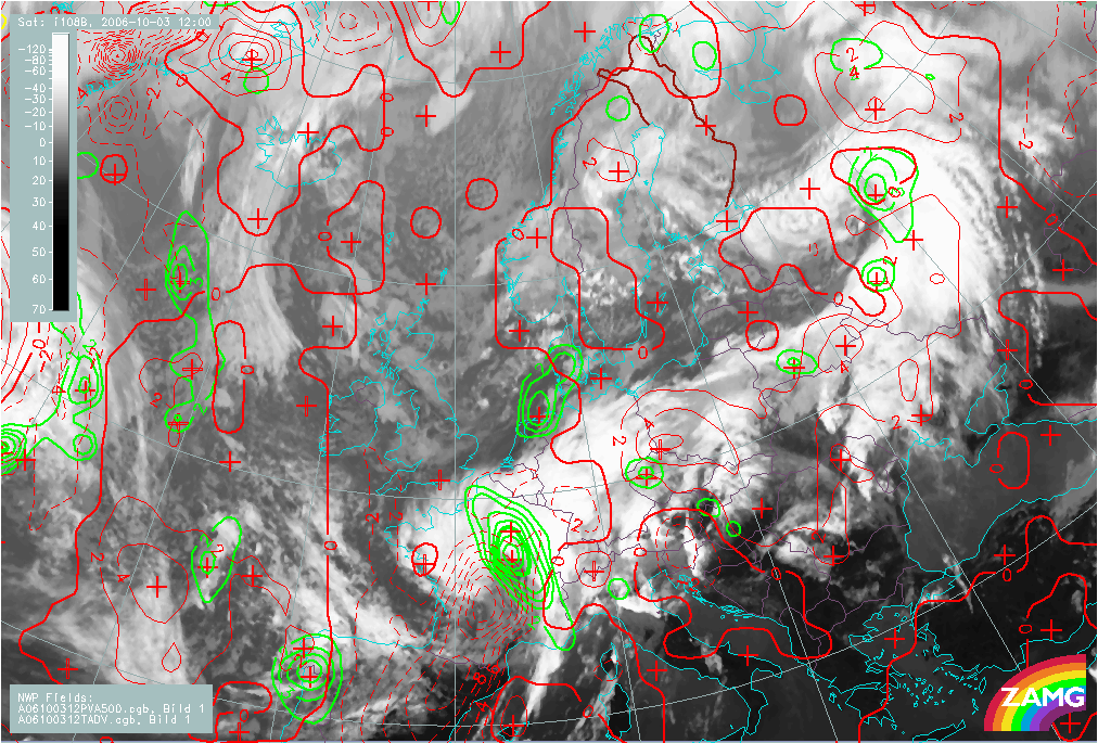 03 October 2006/12.00 UTC - Meteosat 8 IR 10.8 image; green: PVA 500 hPa, red: temperature advection 700 hPa