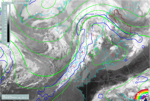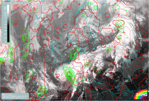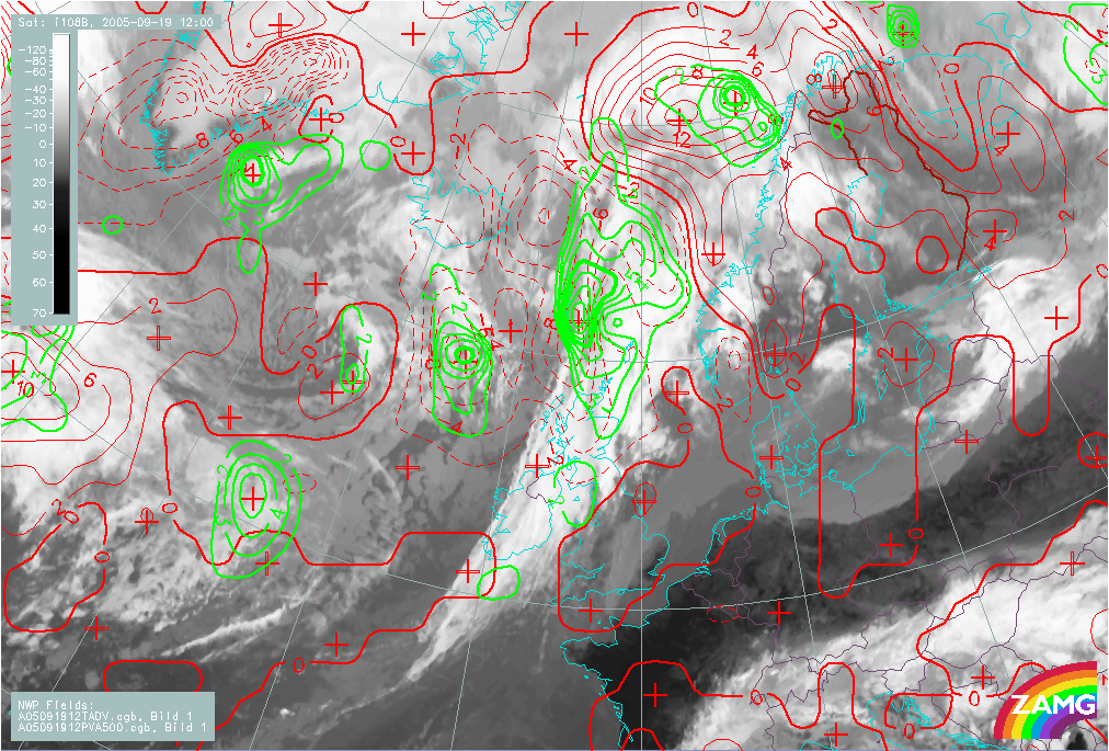19 September 2005/12.00 UTC - Meteosat 8 IR 10.8 image; green: PVA 500 hPA, red: temperature advection 700 hPa