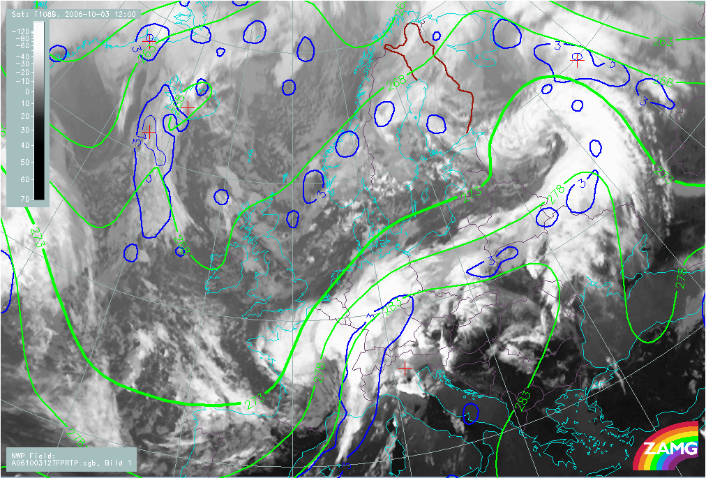 03 October 2006/12.00 UTC - Meteosat 8 IR 10.8 image; blue: TFP, green: equivalent thickness
