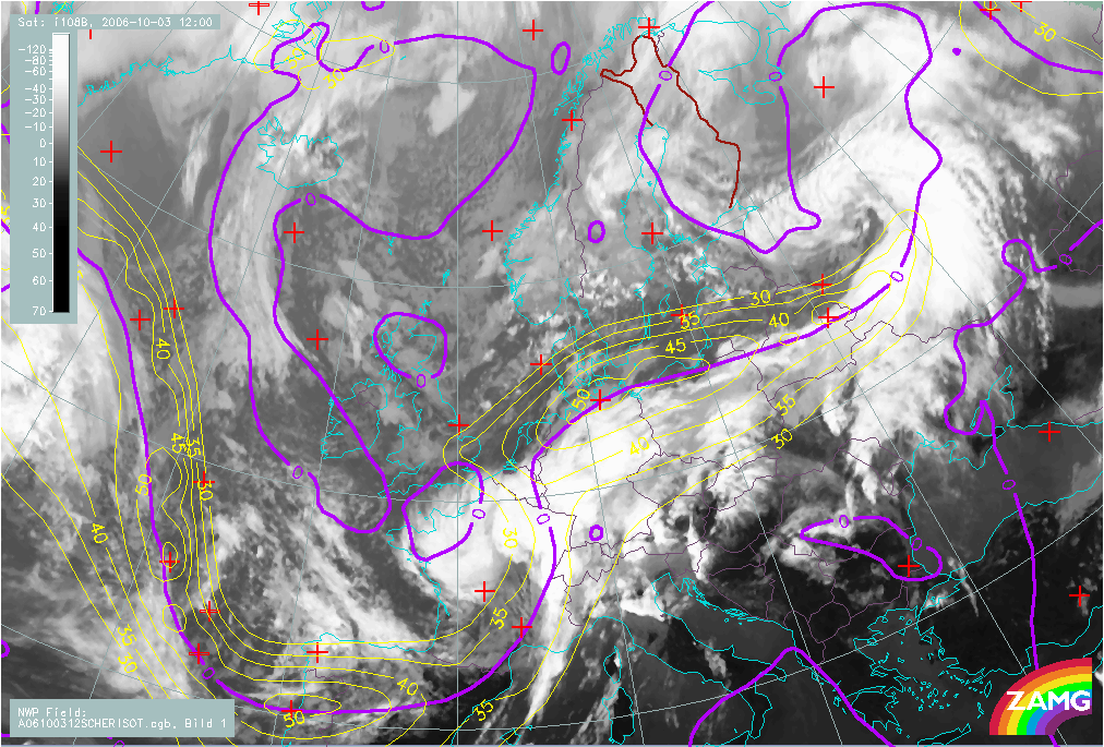 03 October 2006/12.00 UTC - Meteosat 8 IR 10.8 image; magenta: zero line of shear vorticity 300 hPa, yellow: isotachs 300 hPa