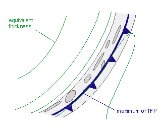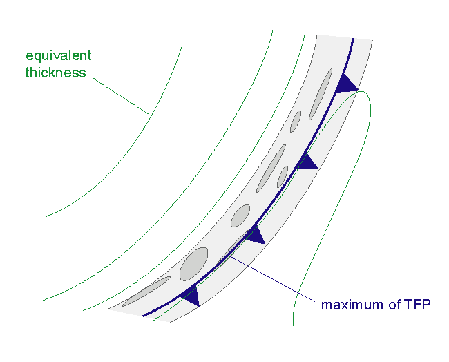 • Equivalent thickness shows a crowding zone near the rear edge of the cloud band, and a ridge ahead of it.