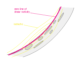 • The zero line of shear vorticity follows the rear edge of the cloud band and coincides the jet stream.