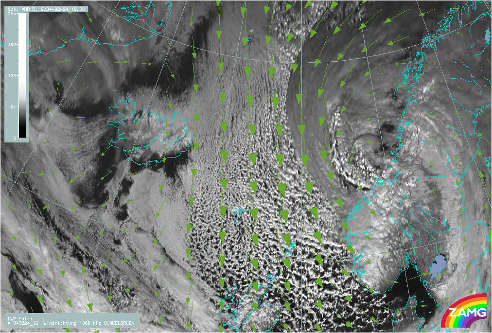 24 February 2004/12.00 UTC - Meteosat 8 Hires VIS image; green: surface wind