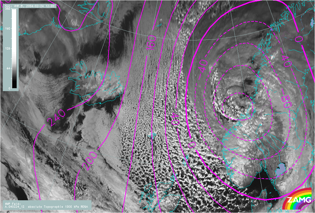 24 February 2004/12.00 UTC - Meteosat 8 Hires VIS image; magenta: Height Contours 1000 hPa