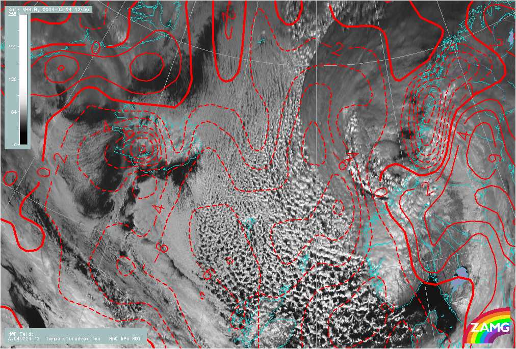 The wind direction often shows a curved profile: in the lowest part of the unstable layer the winds are veering, from the mid-level the winds are backing again. The variation in direction is, however, not very large and usually the winds in the unstable layer vary no more than 20-30 degrees. The wind speed should increase with height to a maximum of at least 20 kt in the middle or upper part of the convection layer. Above these levels the wind may decrease or increase. Numerical prediction models do not represent this small scale variation of the wind well because of their coarser resolution. - Temperature Advection 1000/850 hPa