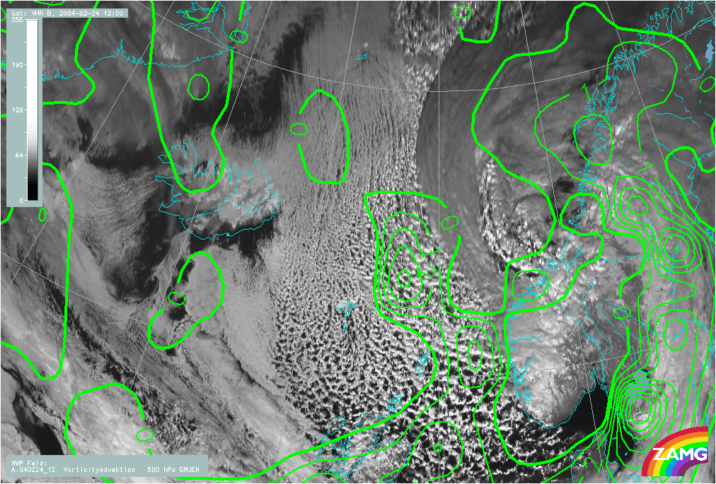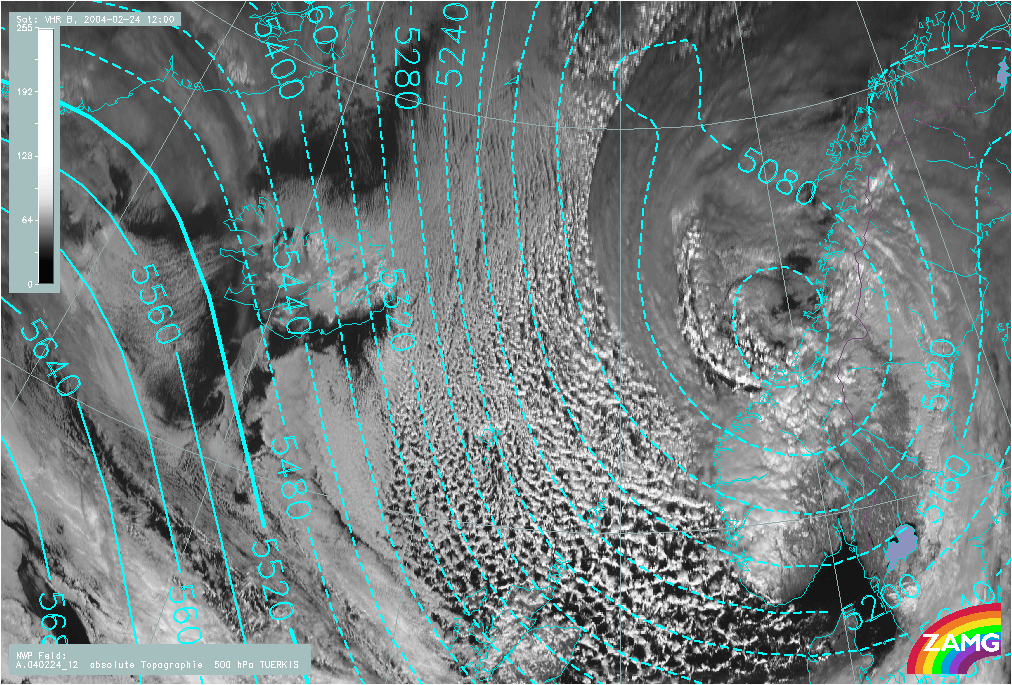 24 February 2004/12.00 UTC - Meteosat 8 Hires VIS image; blue: Height Contours 500 hPa
