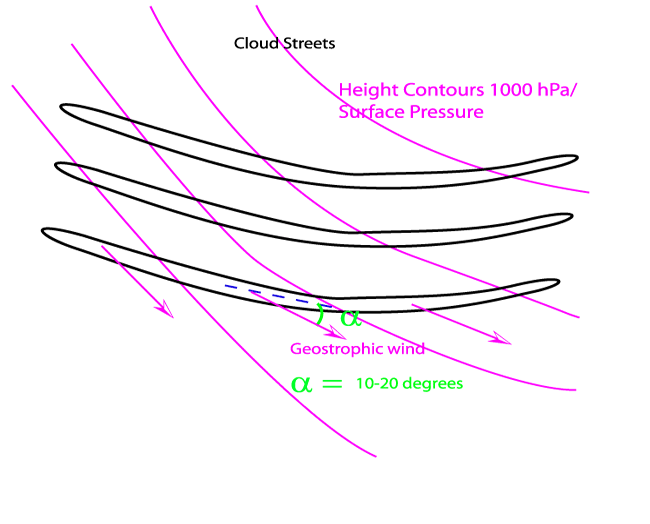 The geostrophic wind is usually aligned with the right hand side of the Cloud Streets, this can also be shown by the height contours at 1000 hPa because the geostrophic wind is orientated parallel to the height contours. - Instability/laps rate